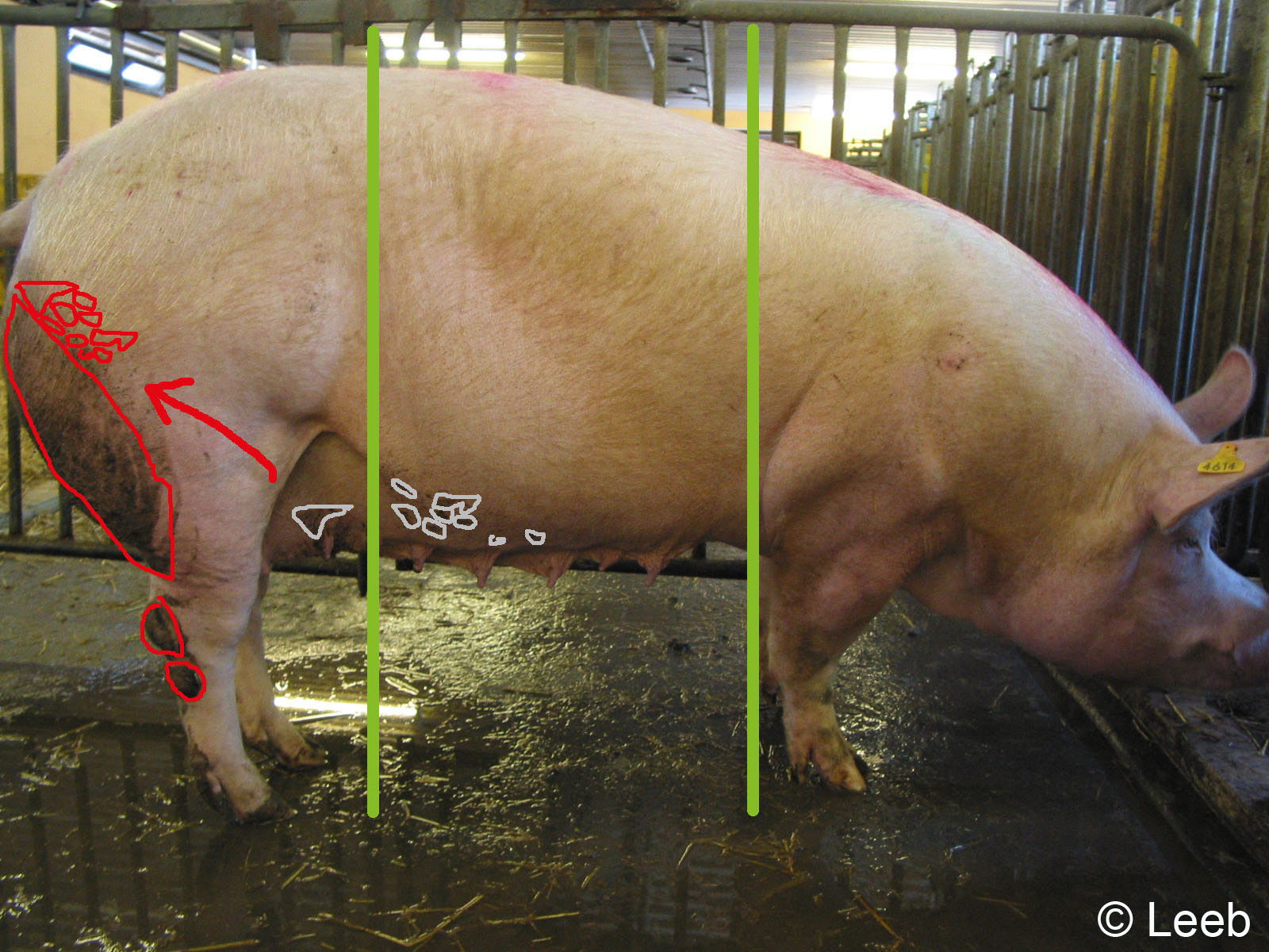 2. Suchen Sie den Körper der Sau nach Kotauflagerungen (rot) ab und schätzen Sie den Flächenanteil der Kotauflagerung ein, wobei Sie sich an der gedanklichen Einteilung des Körpers in drei Teile orientieren.