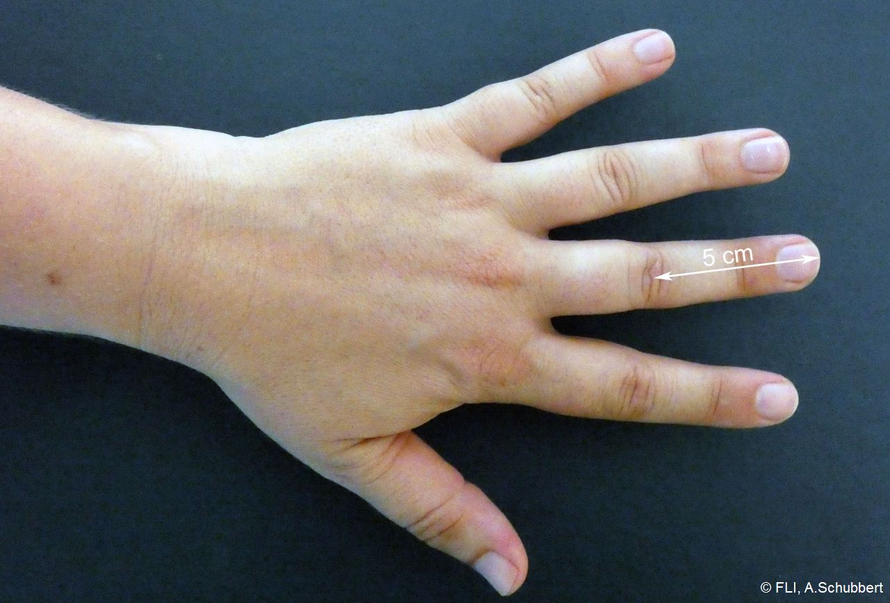 Zum Abmessen des Durchmessers einer Schwellung nutzen Sie am besten die eigenen Hände. Messen Sie vor der Tierbeurteilung einen 5 cm langen Bereich an Ihrer Hand ab.