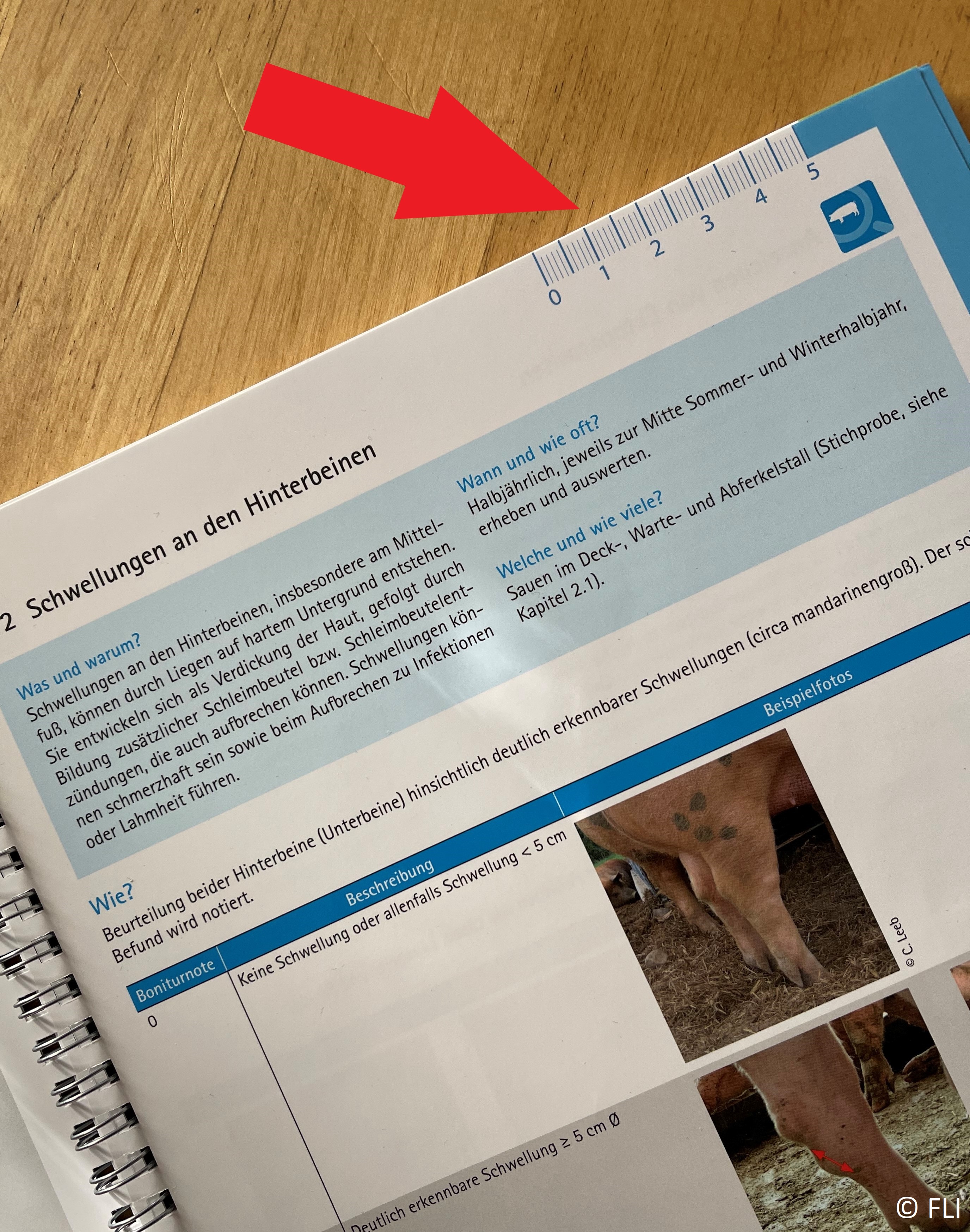 Auf der Seite 25 im Leitfaden finden Sie ein kleines gezeichnetes Lineal, mit einer Länge von 5 cm. Auch das können Sie verwenden, um den Durchmesser von Schwellungen zu messen.