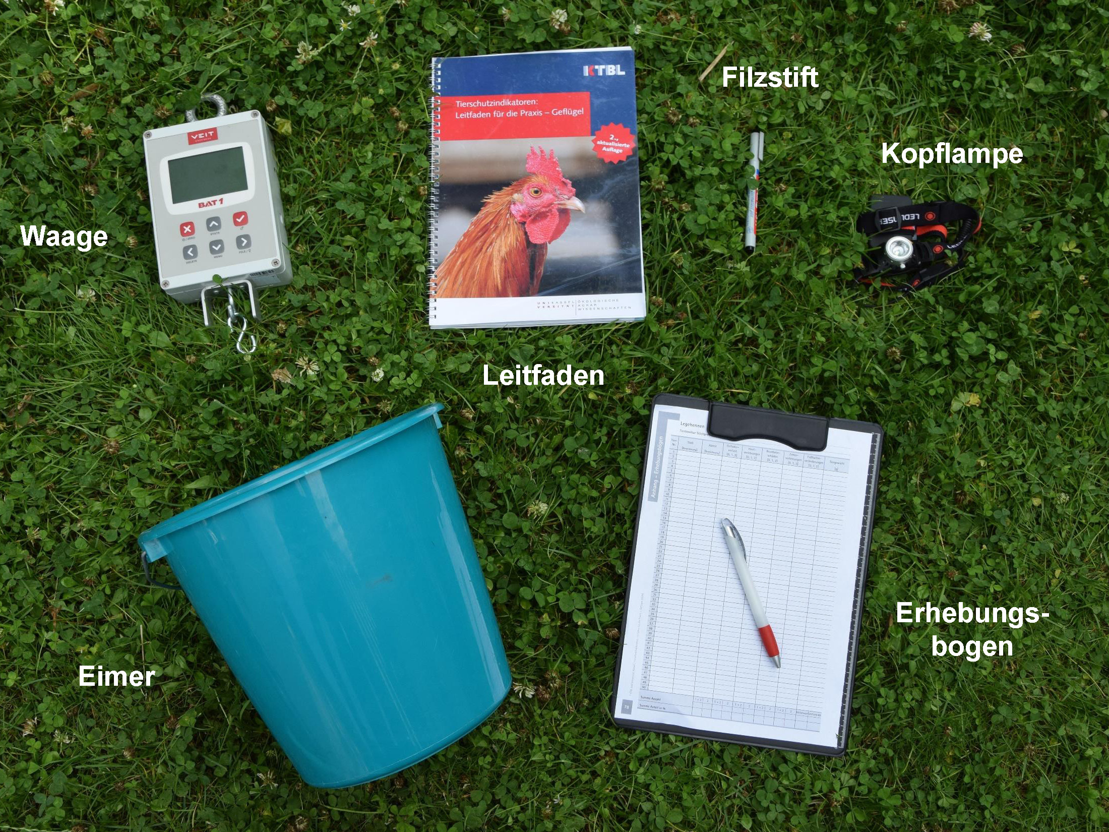 hinaus sind eine Geflügelwaage und ein Eimer zum Wiegen der Hennen sowie