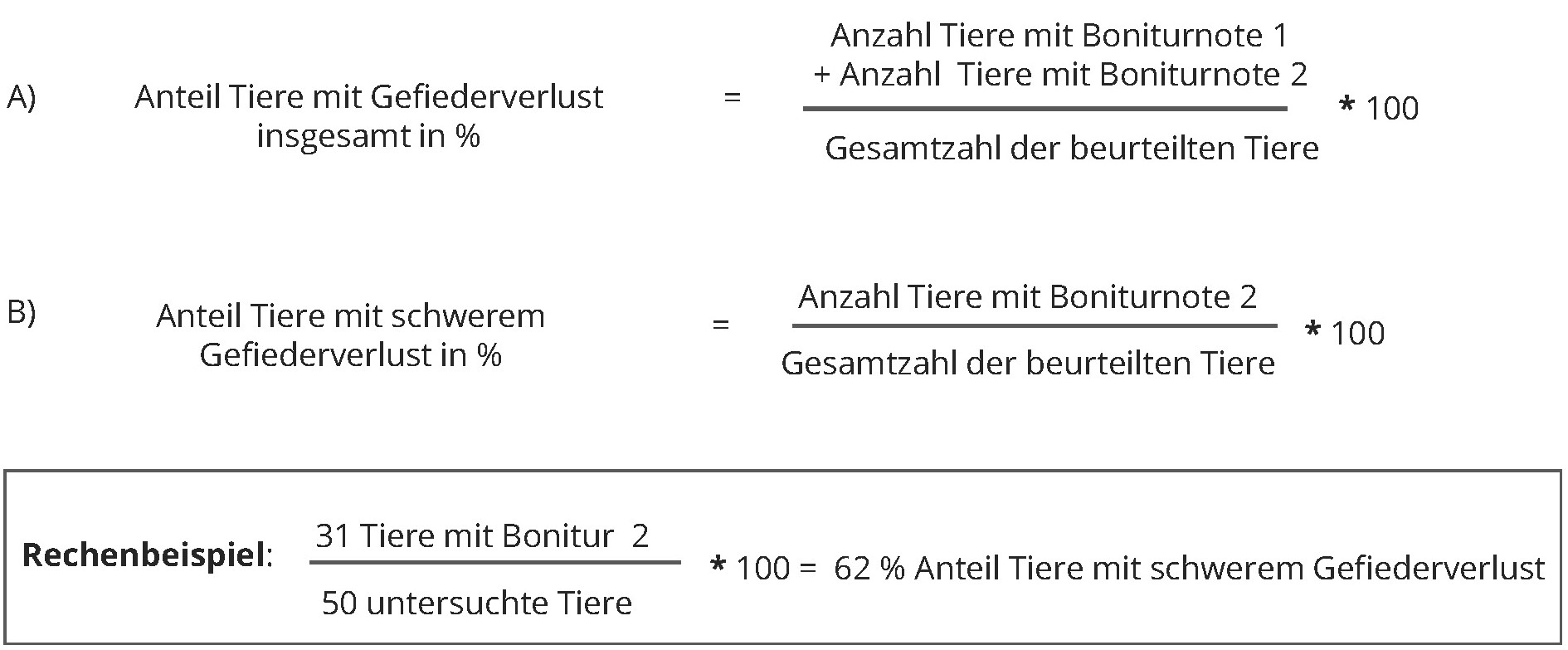 Beurteilung der Gefiederschäden erfolgt durch die Vergabe von 3 Boniturnoten (0, 1, 2) für die Körperregionen Rücken mit Hals- und Schwanzoberseite sowie Legebauch mit Schwanzunterseite. Wenn eine federlose Stelle vorhanden ist, entscheidet sich