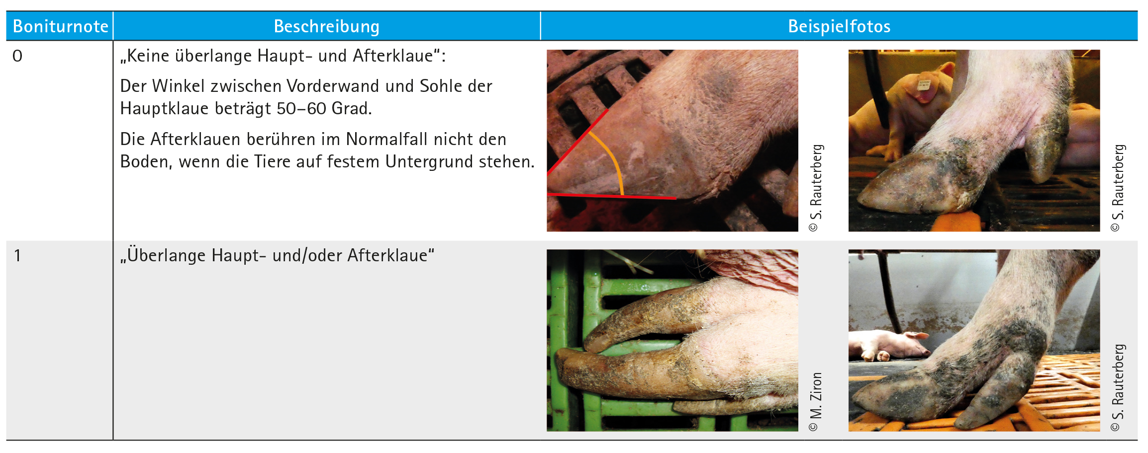 Überlange Klauen werden mit zwei Boniturnoten erfasst. Welche Boniturnote vergeben wird, ist davon abhängig, wie lang Haupt- und Afterklauen sind.