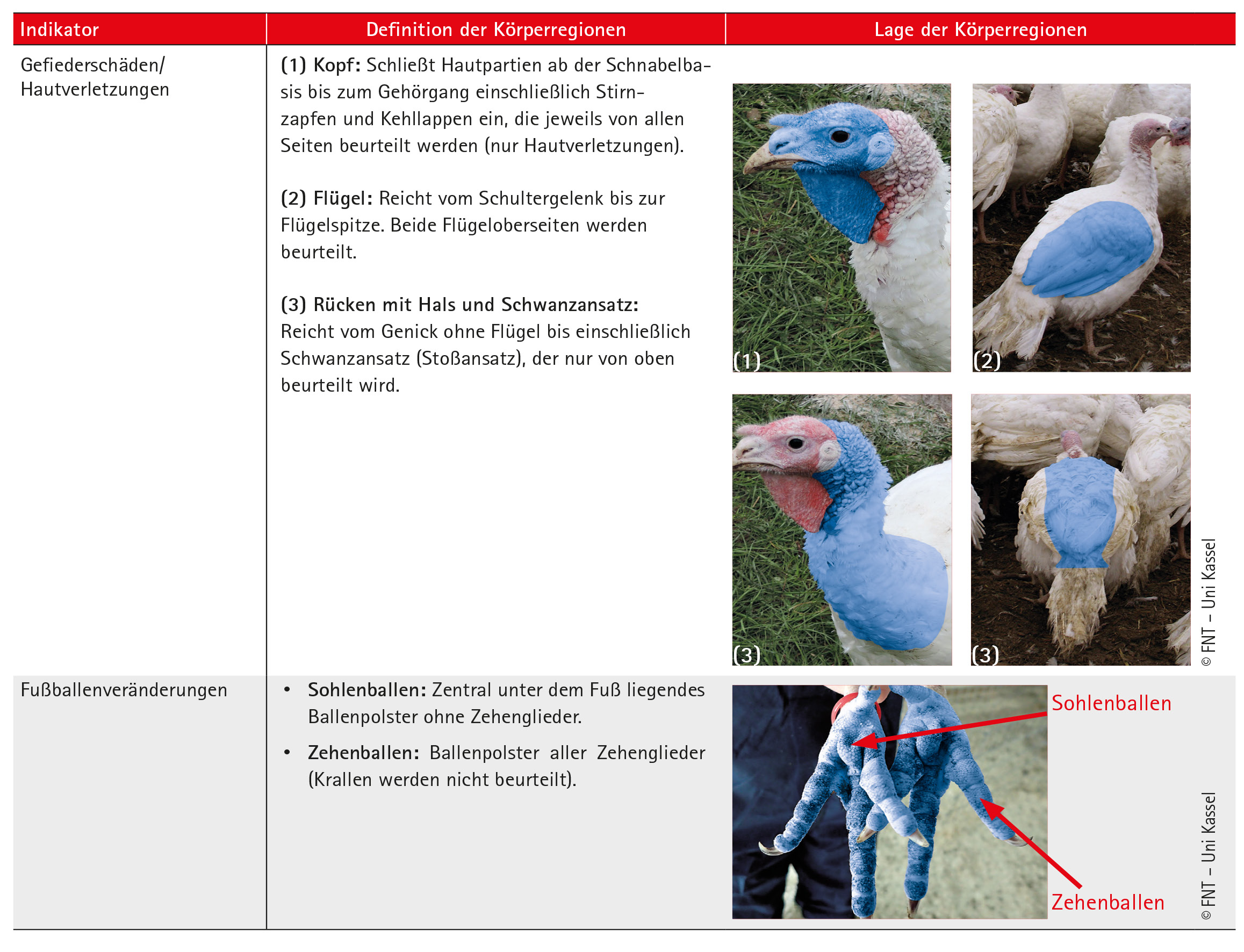Die Bonitierungen werden nur in spezifischen Körperregionen durchgeführt, die für die jeweiligen Tierschutzindikatoren von besonderer Bedeutung sind. In der nachfolgenden Abbildung sind die relevanten Körperregionen beschrieben und blau markiert. Für die Erfassung der Indikatoren werden jeweils alle definierten Körperregionen untersucht und anhand der Boniturschemata beurteilt. Je Indikator wird die Note der am schlechtesten bewerteten Region dokumentiert.